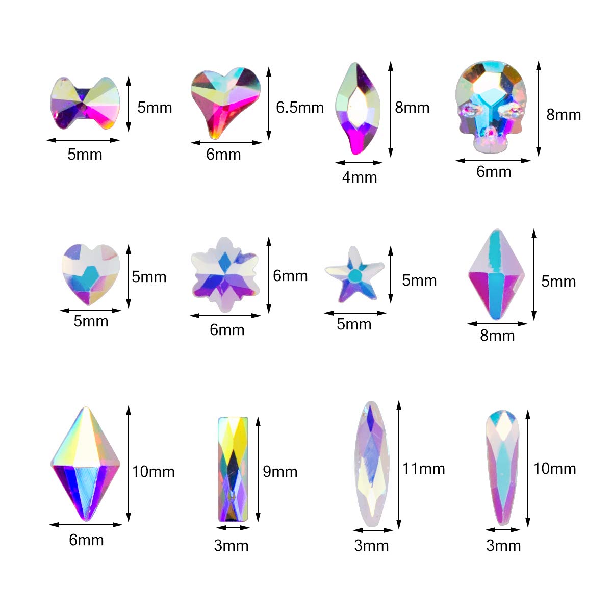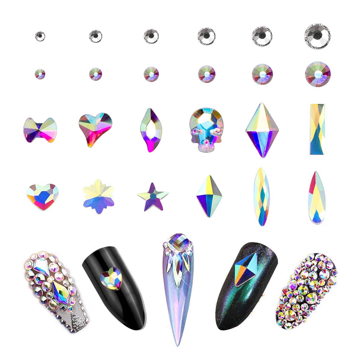 [Multi Size And Multi Shapes]-9340Pcs/Box.Our nail rhinestones kit will come with different sizes and 15 kinds of cute shapes,big ab crystal rhinestones each shape 50pcs,total 700pcs.Small ab rhinestones 8640pcs,each size 1440pcs.Water drop,rhomb,rectangle,moon shape,these multi-shape nail rhinestones for acrylic nail are also fashionable during internet celebrity.You can simply paste several nail jewels rhinestones or combine them with any other nail art accessories.